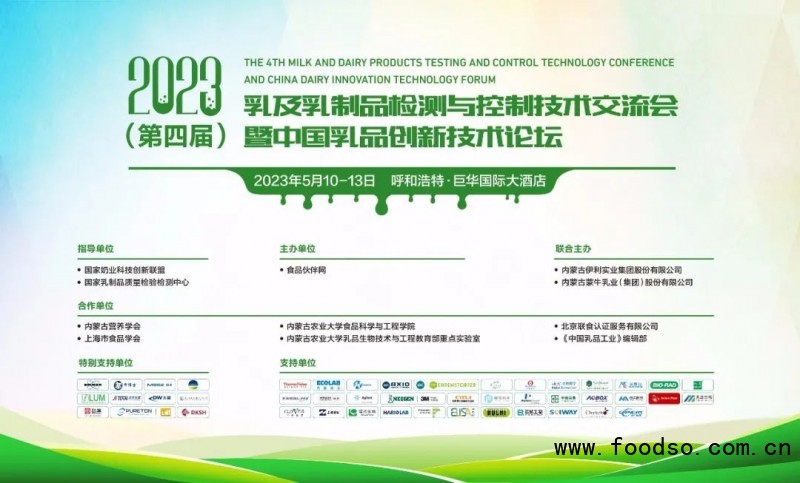 核心提示:由國家奶業(yè)創(chuàng)新科技聯(lián)盟、國家乳制品質(zhì)量檢驗(yàn)檢測中心指導(dǎo),食品伙伴網(wǎng)主辦、內(nèi)蒙古伊利實(shí)業(yè)集團(tuán)股份有限公司和內(nèi)蒙古蒙牛乳業(yè)(集團(tuán))股份有限公司聯(lián)合主辦的“第四屆乳及乳制品檢測與控制技術(shù)交流會(huì)暨中國乳品創(chuàng)新技術(shù)論壇”將于2023年5月10日-13日,在呼和浩特·巨華國際大酒店舉辦,本屆交流會(huì)共設(shè)1個(gè)主會(huì)場,6個(gè)分會(huì)場,邀請30多名行業(yè)專家現(xiàn)場分享。