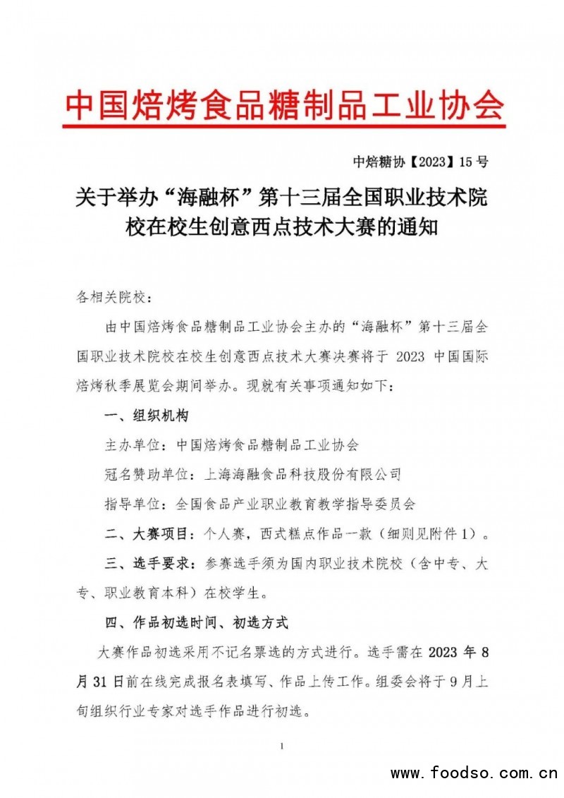關于舉辦“海融杯”第十三屆全國職業(yè)技術院校在校生創(chuàng)意西點技術大賽的通知