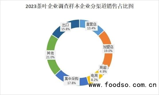 整體來看,在樣本企業(yè)中,線上銷售占比為8.2%,線下銷售依然為企業(yè)銷售的主要渠道。此外樣本企業(yè)2022年出口茶葉8.98萬噸,出口額為20.93億元。