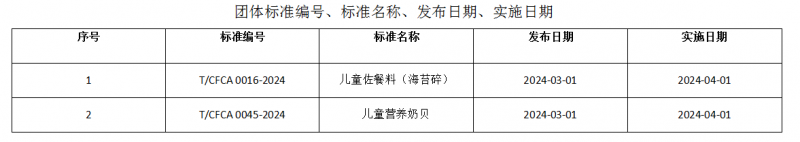 中國副食流通協(xié)會(huì)關(guān)于批準(zhǔn)發(fā)布 《兒童佐餐料(海苔碎)》和《兒童營養(yǎng)奶貝》 團(tuán)體標(biāo)準(zhǔn)的公告