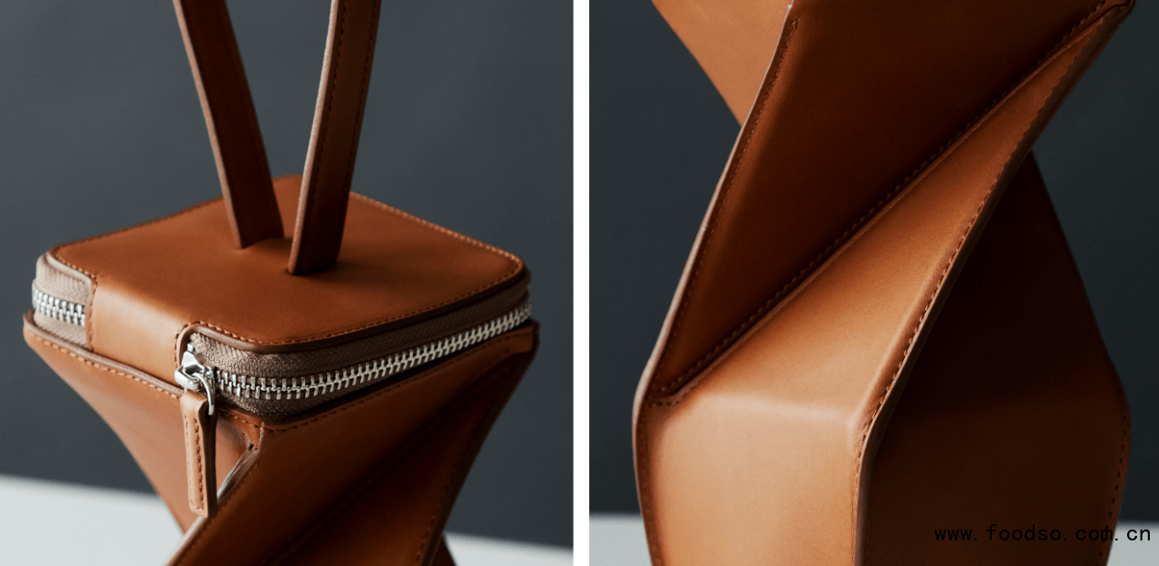 這款皮革包袋不僅僅是為了攜帶葡萄酒杯而誕生的商品,而是如同當(dāng)代藝術(shù)一般,將直線與曲線完美結(jié)合。包袋扭轉(zhuǎn)時(shí)產(chǎn)生的微小間隙得以扣住杯托,是獨(dú)一無(wú)二的設(shè)計(jì)。
