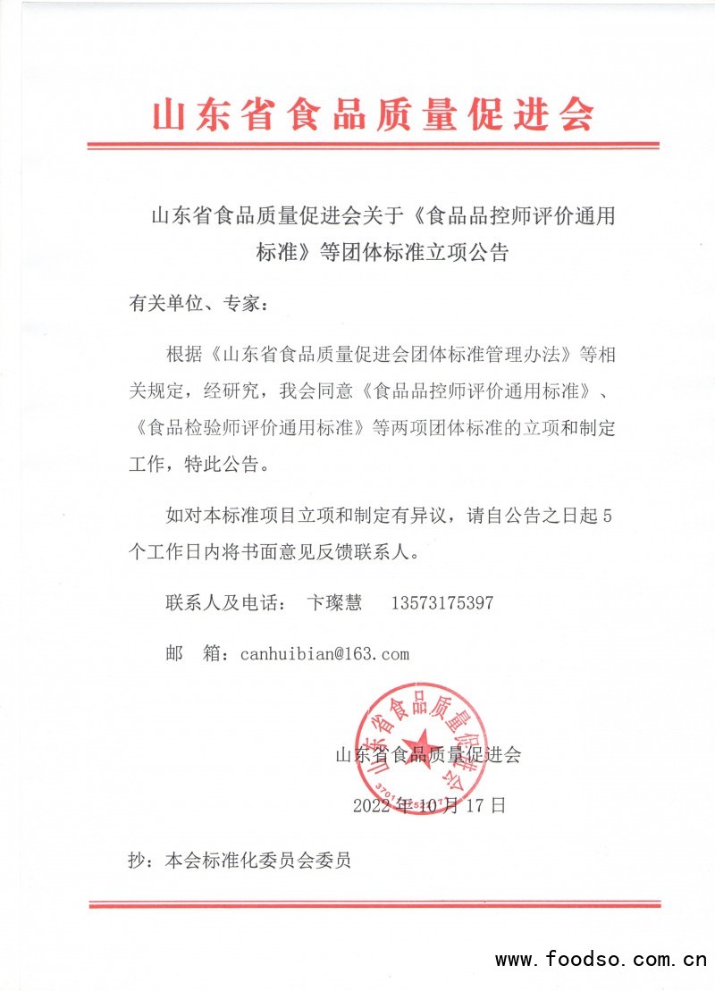 山東省食品質(zhì)量促進(jìn)會關(guān)于《食品品控師評價通用標(biāo)準(zhǔn)》等團(tuán)體標(biāo)準(zhǔn)立項(xiàng)公告