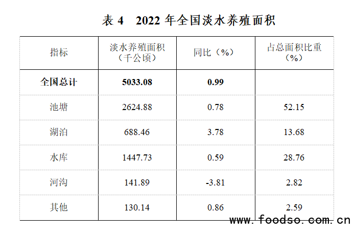 2022年,全國水產(chǎn)養(yǎng)殖面積7107.50千公頃,同比增長1.40%。其中,海水養(yǎng)殖面積2074.42千公頃,同比增長2.41%;淡水養(yǎng)殖面積5033.08千公頃,同比增長0.99%;海水養(yǎng)殖與淡水養(yǎng)殖的面積比例為29.2∶70.8,如表3、表4所示。