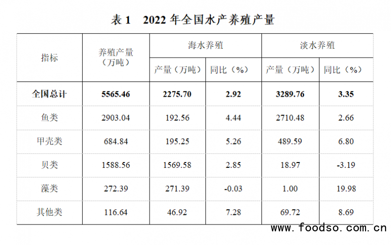 2022年,全國水產(chǎn)品總產(chǎn)量6865.91萬噸,比上年增長2.62%。其中,養(yǎng)殖產(chǎn)量5565.46萬噸,同比增長3.17%,捕撈產(chǎn)量1300.45萬噸,同比增長0.35%,養(yǎng)殖產(chǎn)品與捕撈產(chǎn)品的產(chǎn)量比例為81.1∶18.9,如表1、表2所示;海水產(chǎn)品產(chǎn)量3459.53萬噸,同比增長2.13%,淡水產(chǎn)品產(chǎn)量3406.38萬噸,同比增長3.13%,海水產(chǎn)品與淡水產(chǎn)品的產(chǎn)量比例為50.4∶49.6。