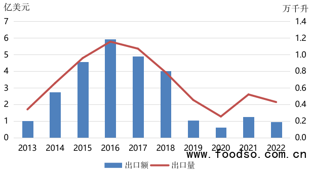 從出口看,2013—2016年,我國葡萄酒出口量額呈逐年增長態(tài)勢;出口量由0.3萬千升增至1.2萬千升,年均增長50.0%。2017—2020年,我國葡萄酒出口規(guī)模連續(xù)3年量額雙減;出口量由1.1萬千升減至0.3萬千升;出口額由4.9億美元減至0.6億美元。2021年,我國葡萄酒出口量額有所回升,分別達0.5萬千升和1.3億美元。2022年,出口量0.4萬千升,同比減少17.5%;出口額1.0億美元,下降24.2%(圖3)。