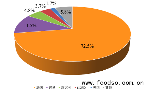 2022年,我國葡萄酒前5大進口來源地分別為法國、智利、意大利、西班牙和美國。其中,自法國進口20.7億美元,占72.5%;自智利進口3.3億美元,占11.5%;自意大利進口1.4億美元,占4.8%(圖6)。