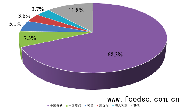 2022年,我國葡萄酒前五大出口市場為中國香港、中國澳門、美國、新加坡和澳大利亞。其中出口中國香港6531.6萬美元,占68.3%;出口中國澳門695.9萬美元,占7.3%;出口美國487.6萬美元,占5.1%(圖9)。