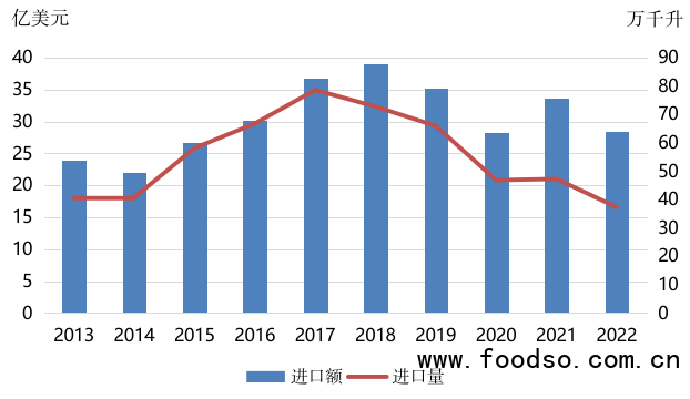 從進口量看,2013—2017年,我國葡萄酒進口量呈逐年上升趨勢,年均增長18.0%。2018—2022年,受反傾銷調(diào)查和新冠疫情等因素影響,我國葡萄酒進口量呈逐年減少趨勢,由2018年的72.7萬千升減至2022年的37.3萬千升。