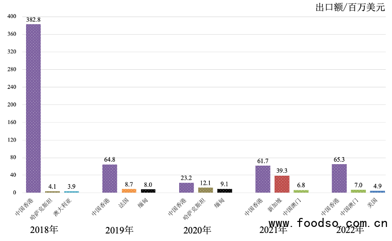 圖7 2018—2022年我國葡萄酒前三大出口市場出口額