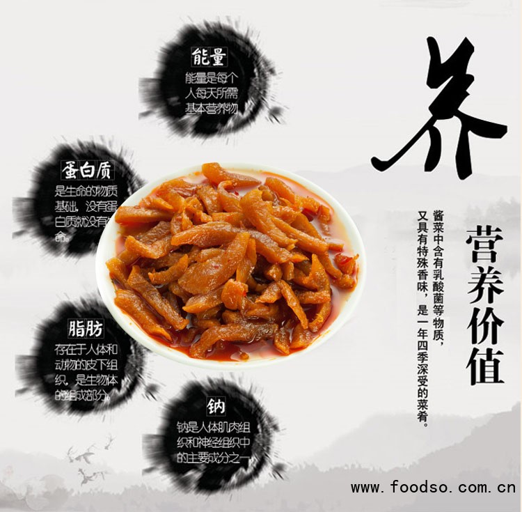 廣州市如豐果子調味食品有限公司創(chuàng)辦于1986年,是一間生產廣式醬菜、高級醬油及調味食品的廣東省重點農業(yè)龍頭企業(yè)。主導產品有:如豐牌香辣蘿卜、白糖蕎頭、XO醬、一滴香生抽,國味威特曲頭抽、糙米白醋、沖上云霄拌飯辣醬,如豐黑蒜等品牌產品。 公司始終堅持以市場為導向,不斷開發(fā)新產品,目前已形成以醬油、醬菜、醬料、調味汁、芝麻油、食醋、蠔油、南腐乳、黒蒜等九大類100多個規(guī)格品種的調味食品專業(yè)生產企業(yè)。 公司一貫遵循“誠信立業(yè)、規(guī)范生產、文明經營”的經營宗旨。在生產過程中,嚴格執(zhí)行國家標準,把好產品質量關,在傳統(tǒng)工藝制作基礎上,結合現(xiàn)代科技,力求創(chuàng)新,生產出“優(yōu)質、安全、口味好、品位高”的產品推向市場。隨著市場拓展,對“如豐”品牌喜愛的顧客群體不斷變大,產品銷量續(xù)年增長,已形成以廣州為中心,以廣東為基礎,輻射全國各地的銷售網(wǎng)絡,如豐食品以優(yōu)質、良好的信譽已贏得社會各界認可,企業(yè)連續(xù)22年獲得“守合同重信用企業(yè)”稱號。2018年公司被評定為“廣東省重點農業(yè)龍頭企業(yè)”稱號;2019年企業(yè)榮獲“廣東省高新技術企業(yè)”稱號。“國味威”商標在世界20多個國家成功注冊,為如豐食品走出國門弘揚“中國味.揚國威”打下基礎。 公司的發(fā)展,有賴于各級政府部門的關心和支持,廣大顧客的信賴,各商家的友好合作,全體仝人的共同努力。我們堅信:“如豐”產品必將走進千家萬戶,必將在廣大顧客心中樹立起良好的品牌形象。