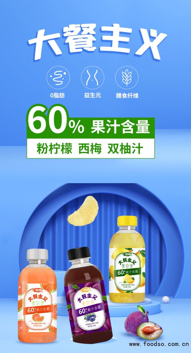 多元口味。為了滿足消費者尤其是年輕“多變”而“挑剔”的口味需求,浩明大餐主義構建起豐富的產品構建,推出了浩明大餐主義粉檸檬復合果汁、西梅膳食纖維果汁飲料、雙柚汁復合果汁飲料等三種口味