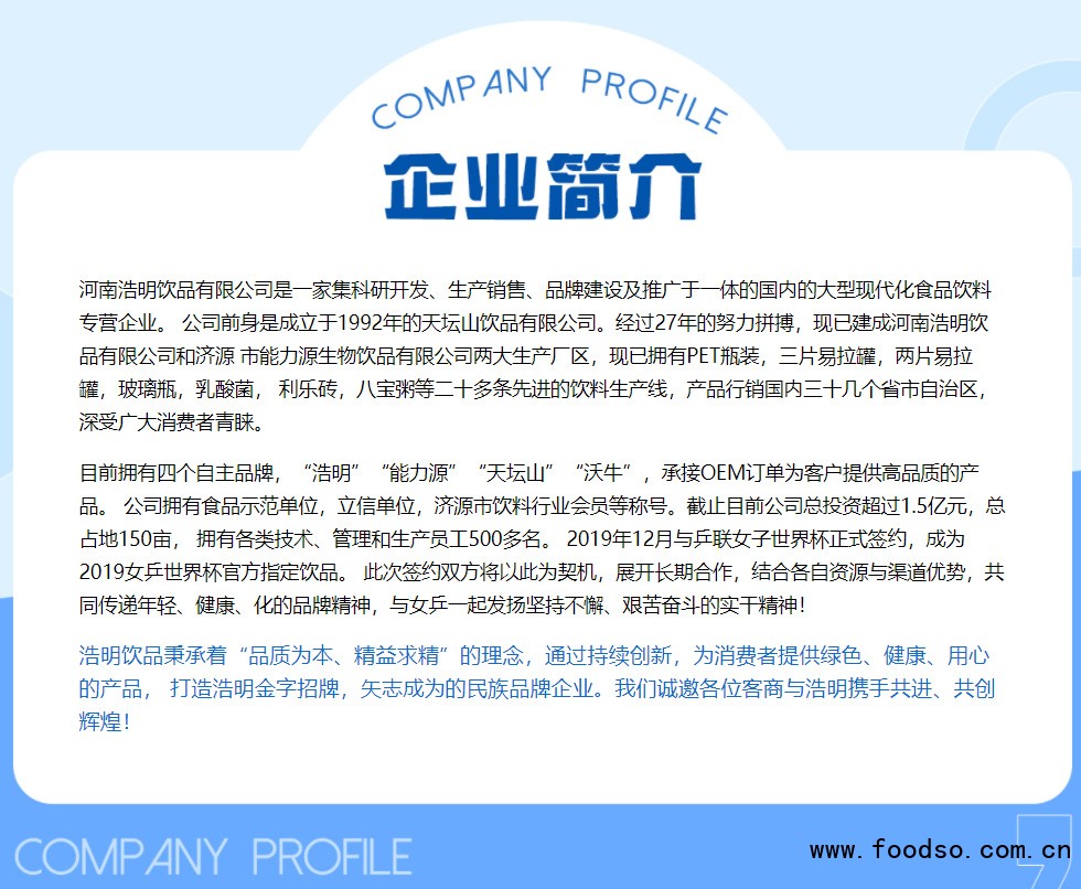 公司前身是成立于1992年的天壇山飲品有限公司。經過27年的努力拼搏,現(xiàn)已建成河南浩明飲品有限公司和濟源市能力源生物飲品有限公司兩大生產廠區(qū),現(xiàn)已擁有PET瓶裝,三片易拉罐,兩片易拉罐,玻璃瓶,乳酸菌,利樂磚,八寶粥等二十多條先進的飲料生產線,產品行銷國內三十幾個省市自治區(qū),深受廣大消費者青睞。目前擁有四個自主品牌,“浩明”“能力源”“天壇山”“沃牛”,同時為客戶提供私人訂制服務,并承接OEM訂單為客戶提供高品質的產品。公司擁有食品示范單位,立信單位,濟源市飲料行業(yè)會員等稱號。截止目前公司總投資超過1.5億元,總占地150畝,擁有各類技術、管理和生產員工500多名。2019年12月與乒聯(lián)女子世界杯正式簽約,成為2019女乒世界杯官方指定飲品。此次簽約雙方將以此為契機,展開長期合作,結合各自資源與渠道優(yōu)勢,共同傳遞年輕、健康、化的品牌精神,與女乒一起發(fā)揚堅持不懈、艱苦奮斗的實干精神!